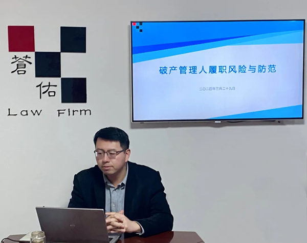 阳春三月、春暖花开,我所组织开展了2024年的首场“苍佑论坛”活动,本次论坛主讲人为我所合伙人律师田浩轩,论坛主题为“破产管理人履职风险与防范”。