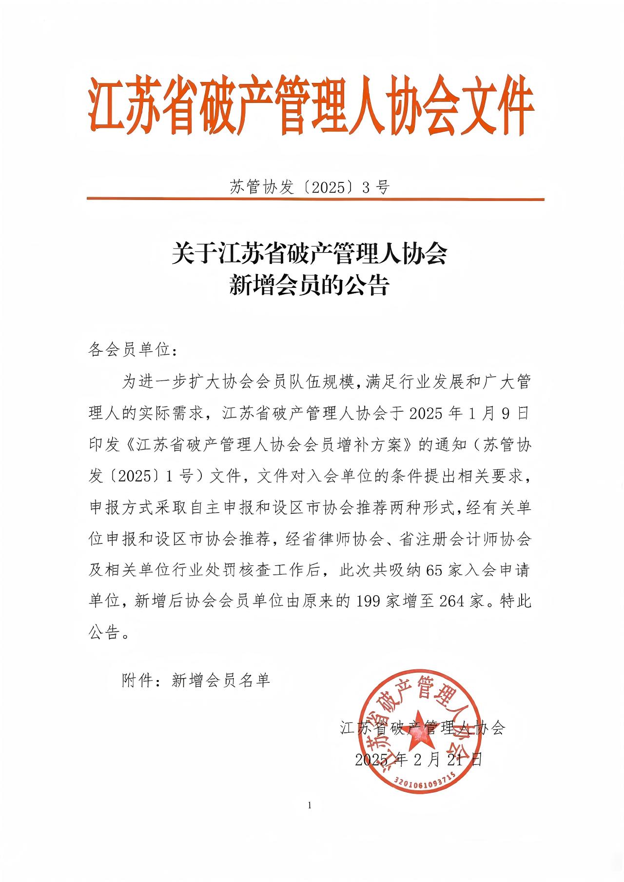 经申报与审核,我所成功入选江苏省破产管理人协会会员。一直以来,我们在破产领域精耕细作,处理过诸多案件,积累了丰富经验。 此次入选,是荣誉更是责任。未来,我们会借助协会平台,加强交流合作,提升服务水平,为破产管理行业发展出力,也为客户带来更优质服务 。期待与大家携手,共创佳绩!
