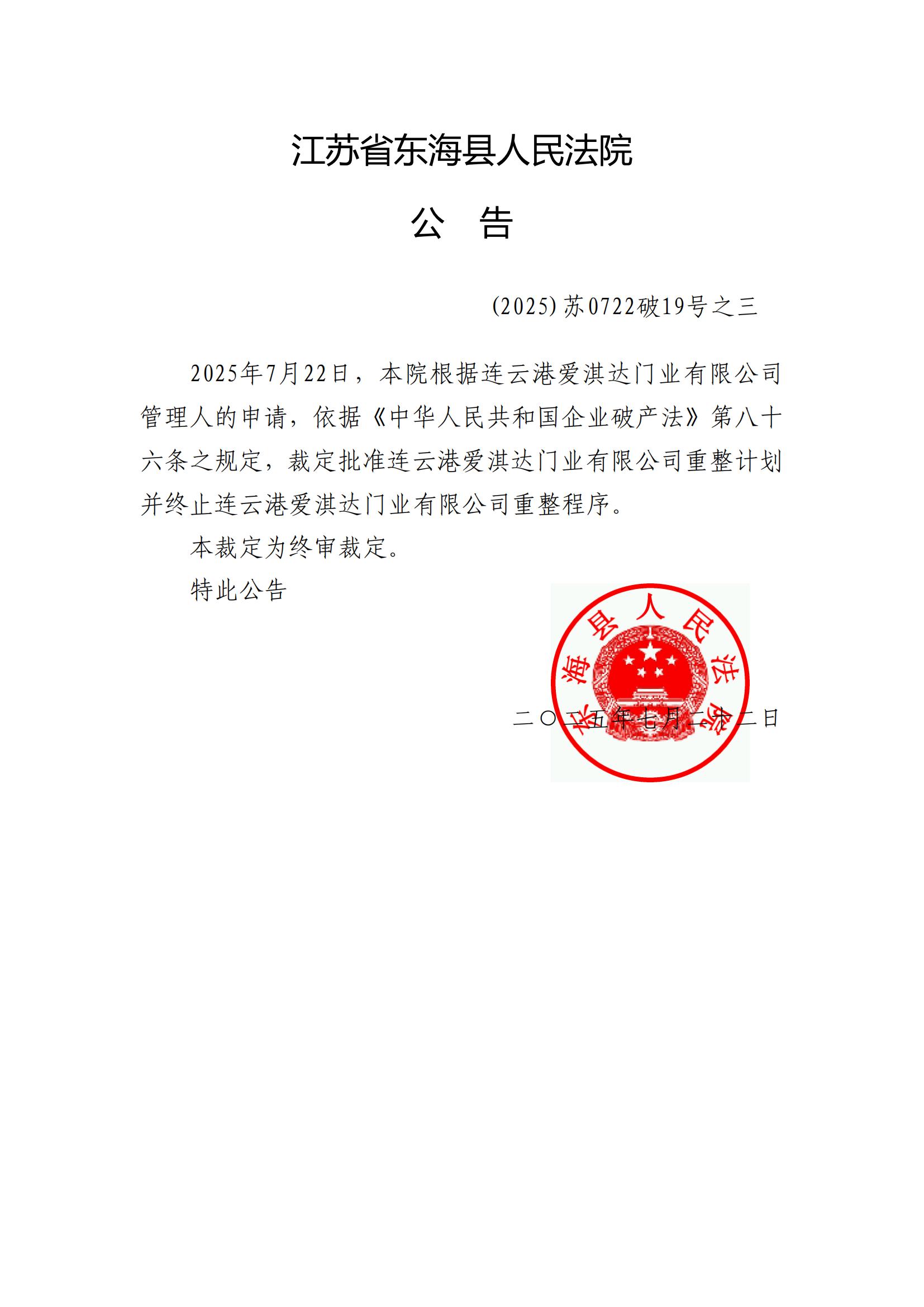 连云港爱淇达门业有限公司(批准重整计划并终止重整程序公告)
