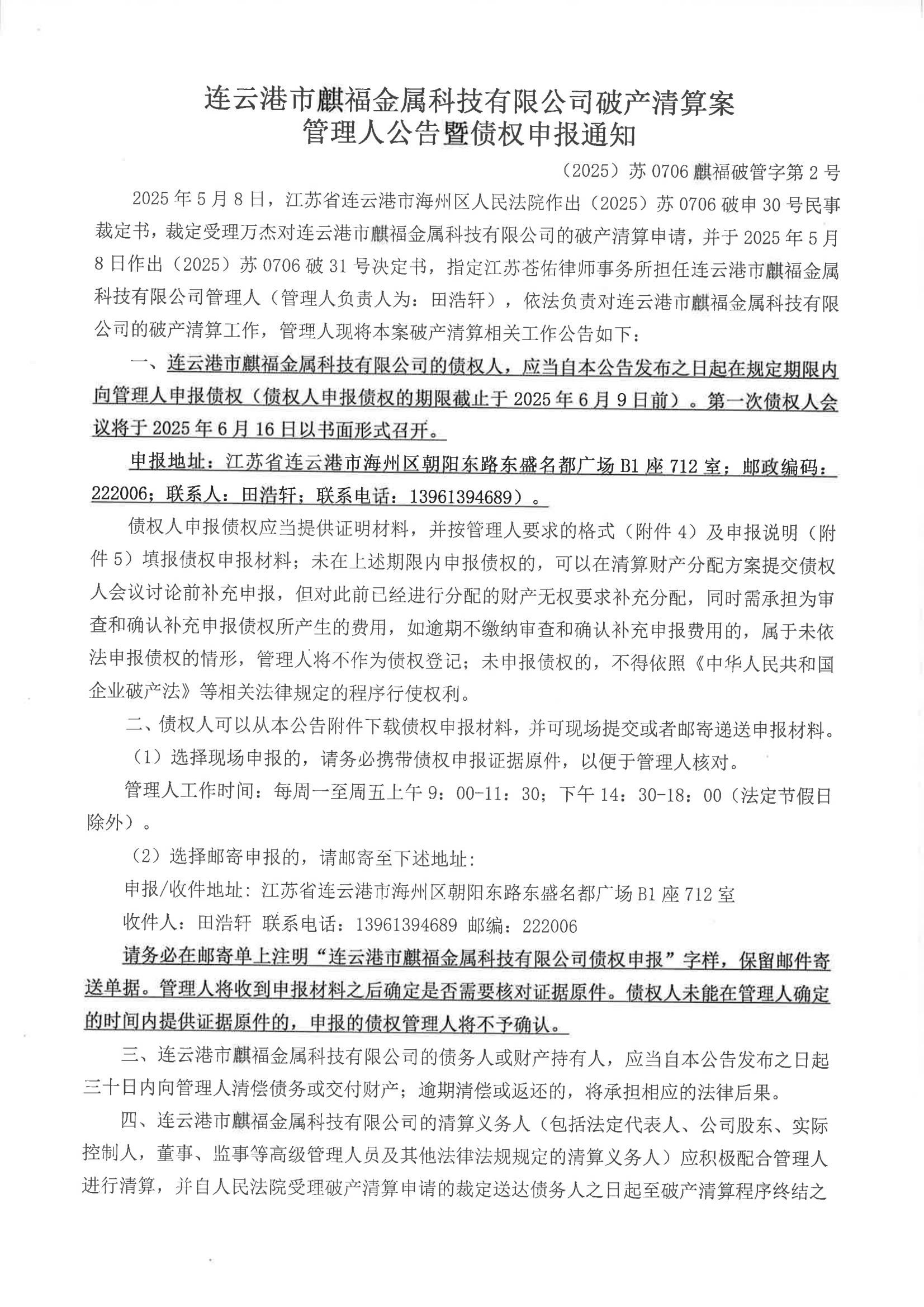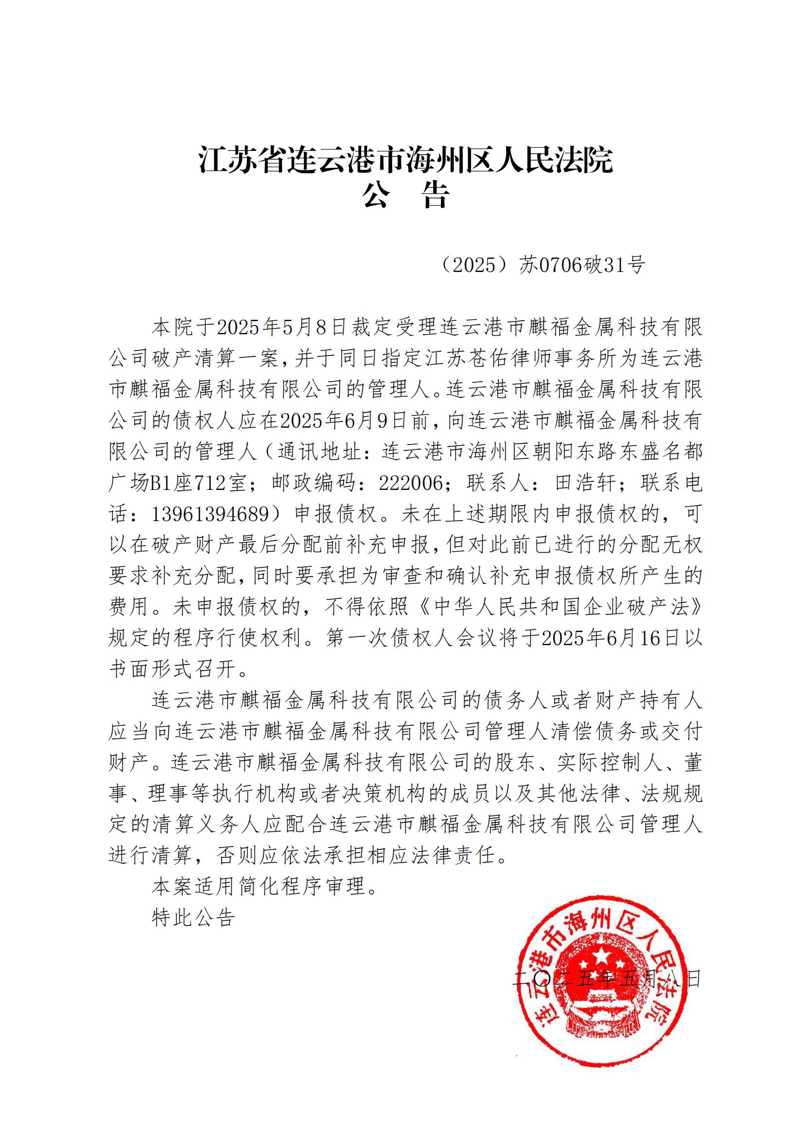 连云港市麒福金属科技有限公司破产清算公告(管理人公告) |
