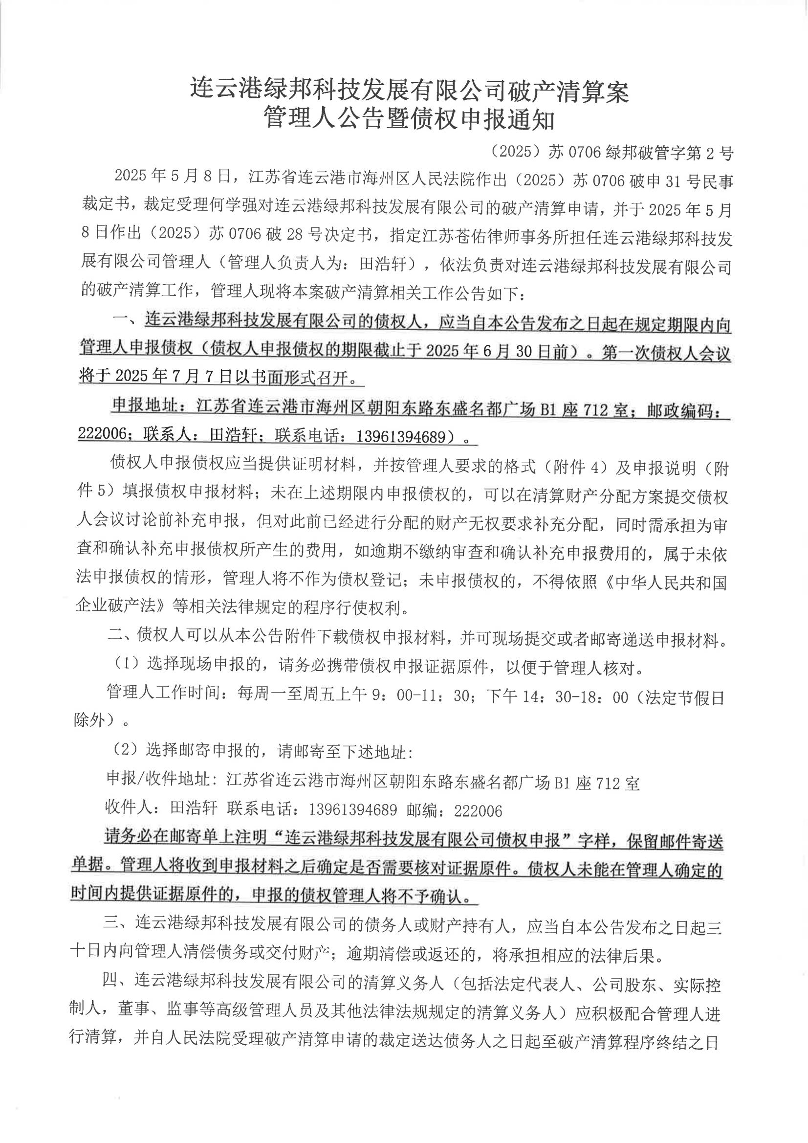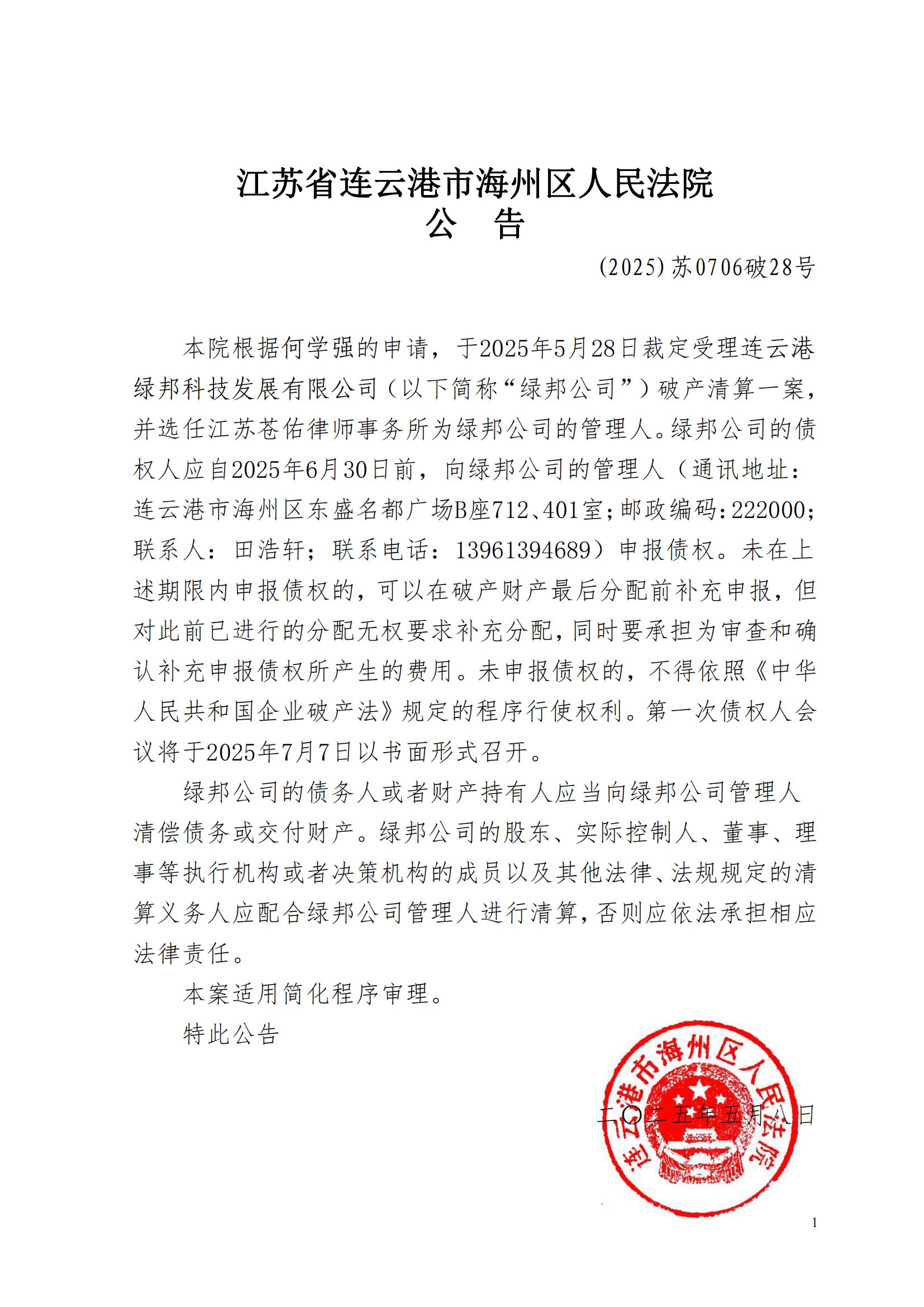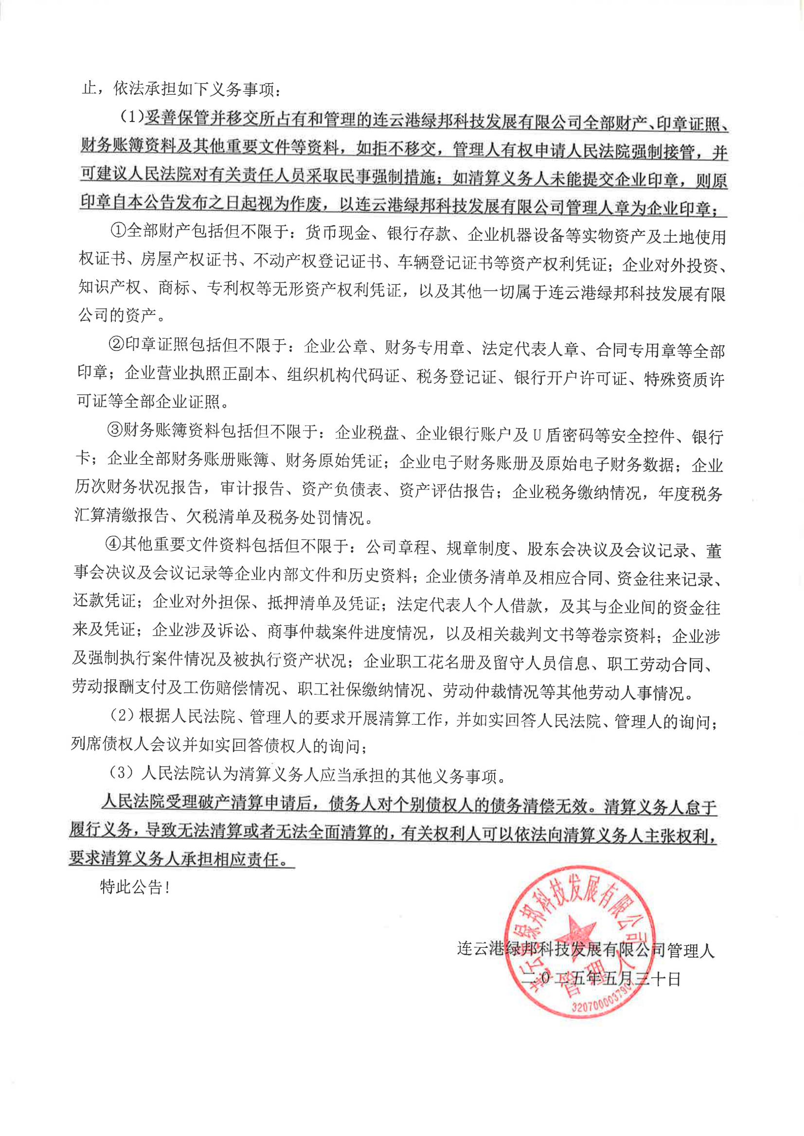 连云港绿邦科技发展有限公司破产清算公告(管理人公告) |