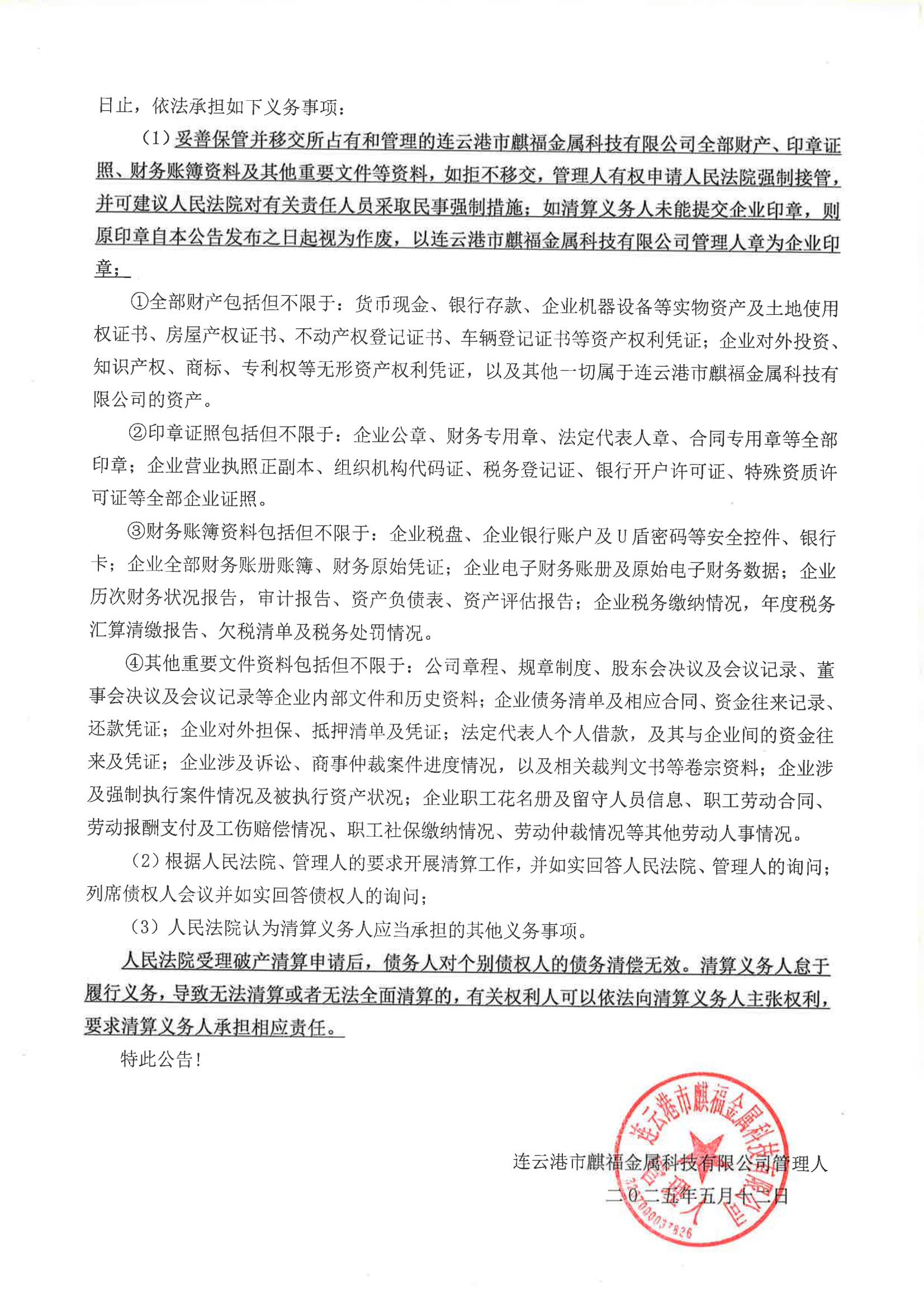 连云港市麒福金属科技有限公司破产清算公告(管理人公告) |